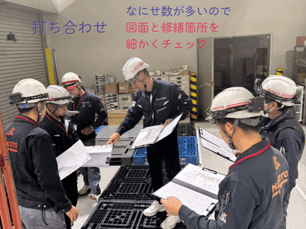 「ひぇぇぇぇ😳」だし、「間違えそうーっ😅」って感じだったので、それぞれ何の修繕をするのかを一目でわかるように配置図を作成して、工事に入る前には全員でみっちり打ち合わせ👷♂️👷♂️👷♂️👷♂️👷♂️